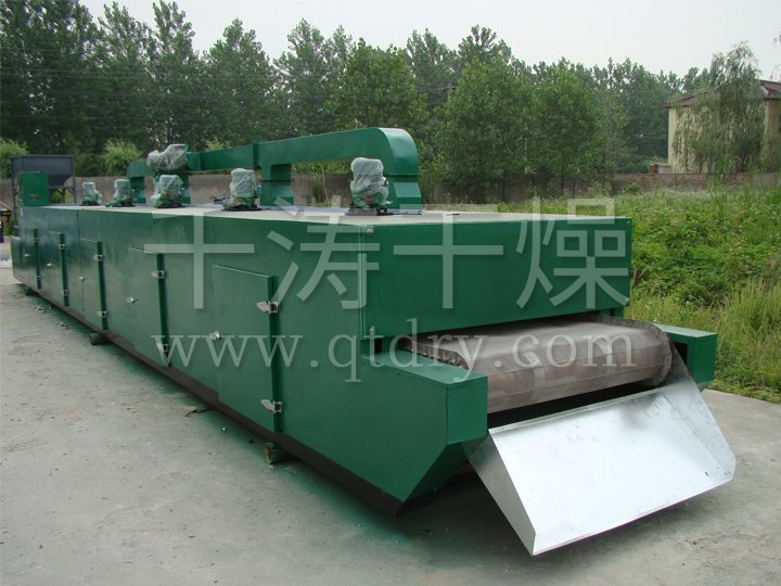 物料由加料器均勻地鋪在網(wǎng)帶上,網(wǎng)帶一般采用12-60目不銹鋼絲網(wǎng),由傳動(dòng)裝置拖動(dòng)在干燥機(jī)內(nèi)移動(dòng)。干燥機(jī)由若干單元組成,每一單元熱風(fēng)獨(dú)立循環(huán),部分尾氣由專門排濕風(fēng)機(jī)排出,廢氣由調(diào)節(jié)閥控制,熱氣由下往上或由上往下穿過鋪滿物料的網(wǎng)帶完成熱量與質(zhì)量傳遞的進(jìn)程,帶走物料水份。網(wǎng)帶緩慢移動(dòng),運(yùn)行速度可根據(jù)物料溫度自由調(diào)節(jié),干燥后的成品連續(xù)落入收料器中。上下循環(huán)單元根據(jù)用戶需要可靈活配備,單元數(shù)量亦可根據(jù)需要選取。