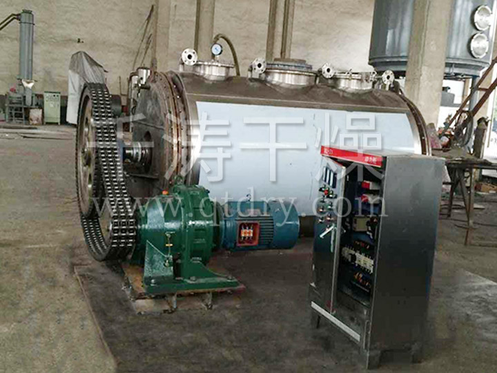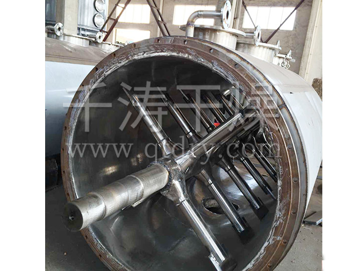 本機是一種新穎臥式間歇式真空干燥設(shè)備,濕物料經(jīng)傳導蒸發(fā),帶有刮板攪拌器不斷清除熱面上的物料,并在容器內(nèi)推移形成循環(huán)流,水份蒸發(fā)后由真空泵抽出。